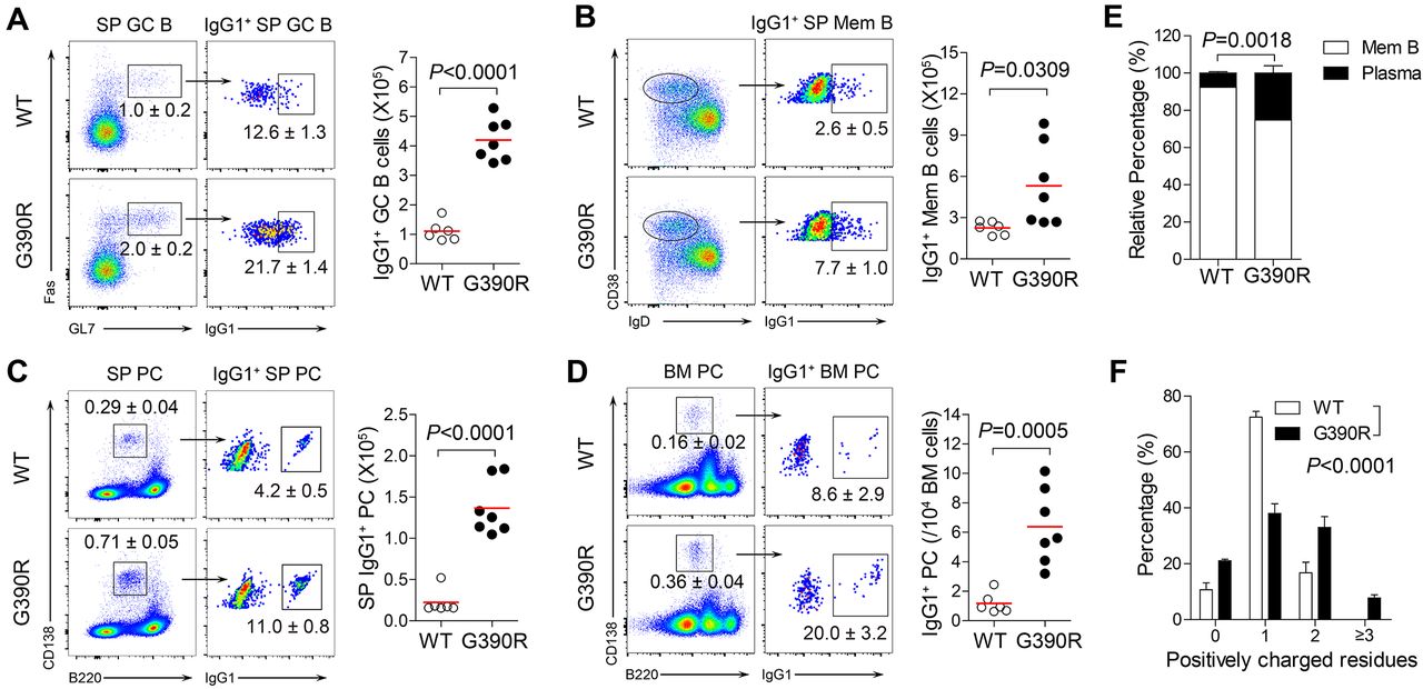 (E) The relative percentage (means ± SEM) of IgG1+ plasma cells and memory B cells in fate-selected cells of WT in comparison to G390R mice.