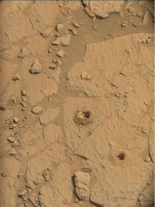 NASA’s Mars rover Curiosity acquired this image showing the side-by-side drill holes “Nevado Sajama” (right) and “Nevado Sajama2” (left). Curiosity used its Mast Camera (Mastcam) to capture the image on Jan. 31, 2026 — Sol 4795, or Martian day 4,795 of the Mars Science Laboratory mission — at 22:55:27 UTC.