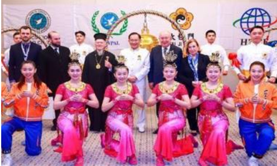 Photo:Ecumenical Patriarch Bartholomew I rings the Bell of World Love and Peace and poses with Dr. Hong Tao-Tze, Dr. Akkan Suver, and other guests.
