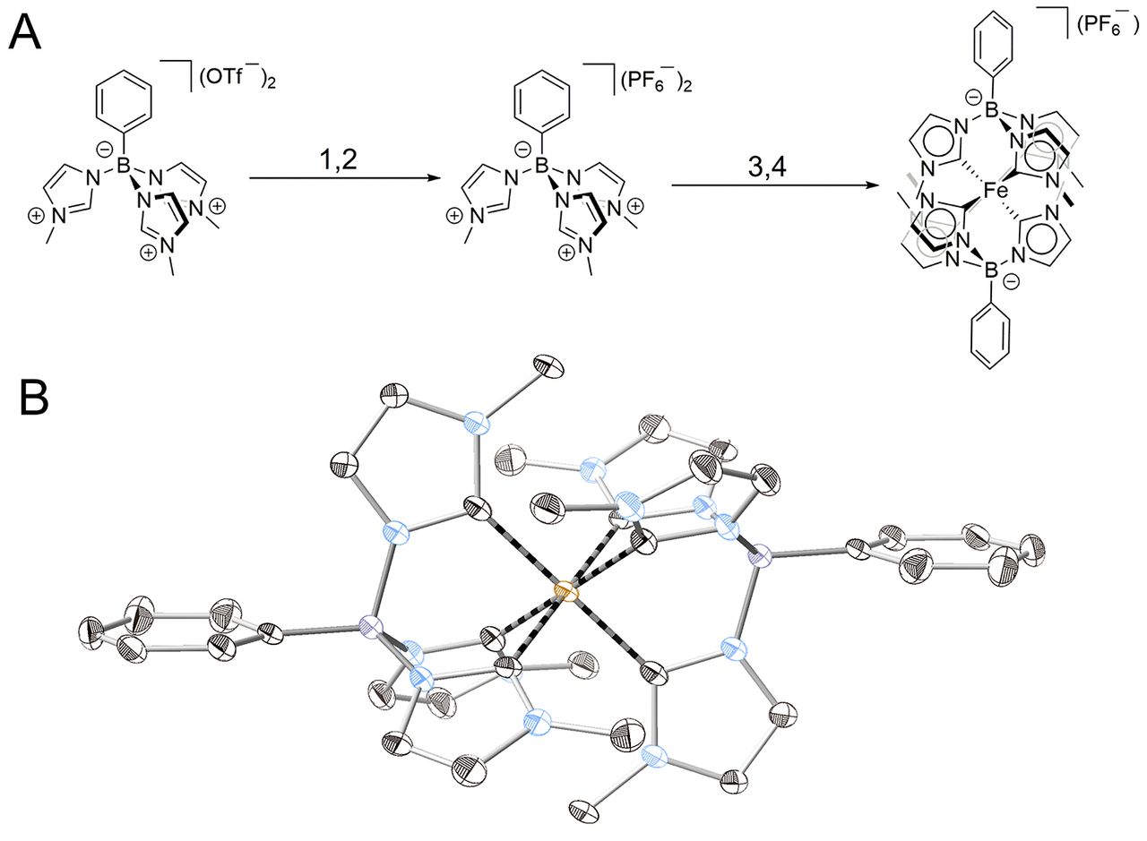 (B) X-ray crystal structure. Thermal ellipsoids are shown at 50% probability with the six Fe-C bonds highlighted in black. Hydrogen atoms, counter ions and solvent molecules are omitted for clarity. Fe, orange; B, purple; N, blue; C, black.