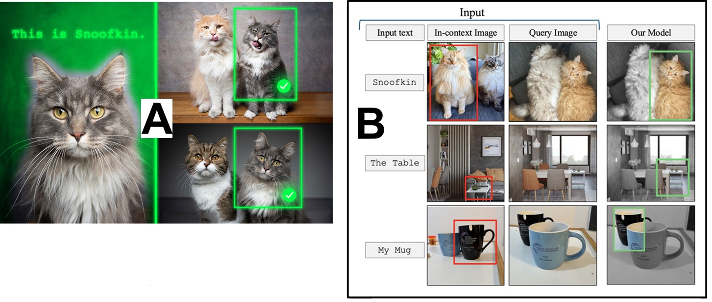 (B) The model is tasked with localizing the same object of interest in the query image. Here, the team visualizes a few inputs and outputs showing how the new method captures information and then localizes the personalized object.