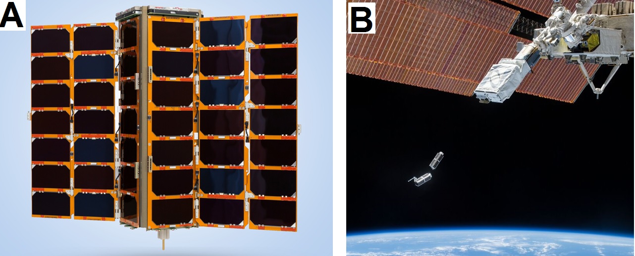 (B) One of the organizations in NASA's Private Sector Small Constellation Satellite Data Product Pilot program, Planet, has several satellite constellations including Dove. Two of the Dove small satellites are shown here deploying from the International Space Station.