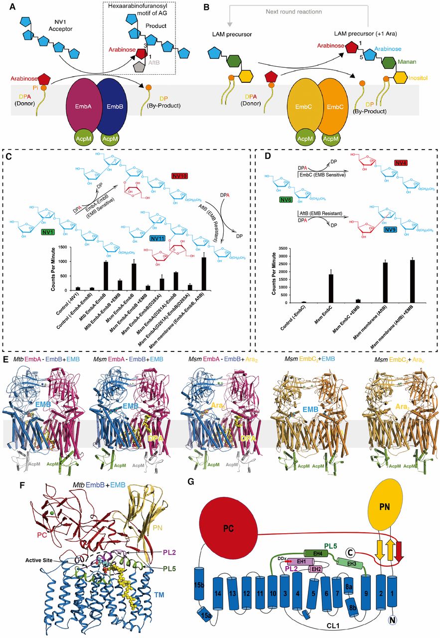 (F) The overall fold of Emb proteins represented by Mtb EmbB. The PN, PC and TM domains are colored differently. The functional important PL2 and PL5 are also highlighted. The location of active site is marked by a dashed circle. PN/PC, N-/C-terminal periplasmic domain; TM transmembrane domain; PL, periplasmic loop connecting two transmembrane helices.