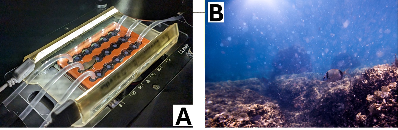(A) Researchers created a microfluidic system to study sinking marine snow, pictured here mounted on a microscope.