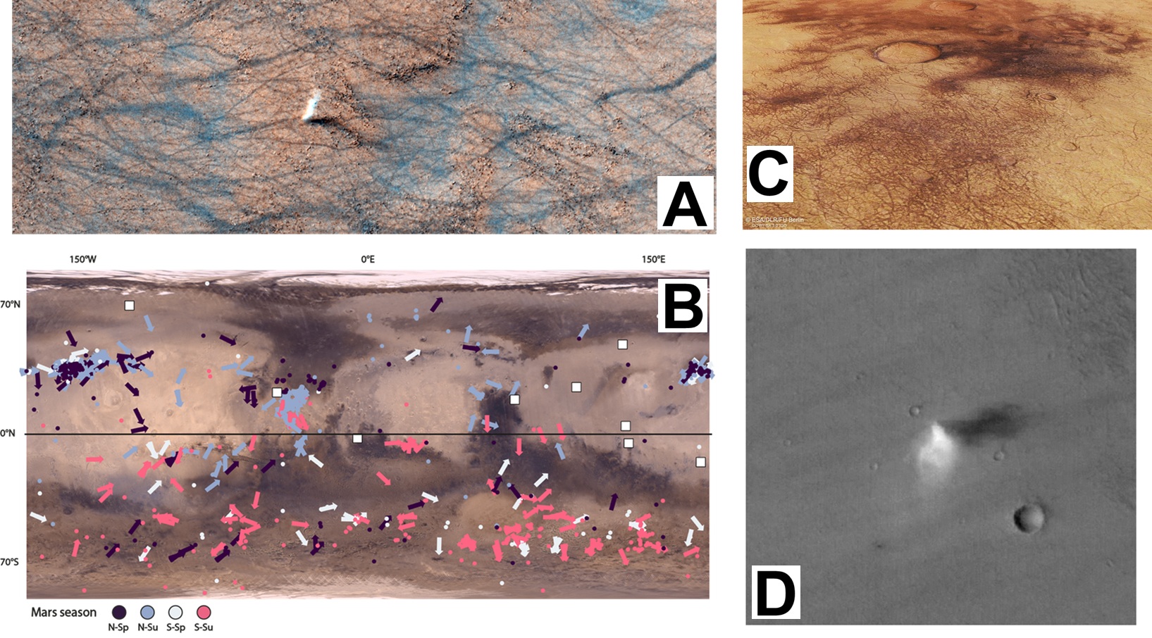 風的移動和塵埃的攪動常常會形成所謂的塵埃捲風,即旋轉的塵埃和空氣柱,它們沿著盛行風的方向在火星表面移動。風本身在影像中是看不見的,但塵捲風卻清晰可見。它們的向前移動使其成為研究人員識別原本看不見的風的寶貴指標。地球上也存在塵捲風,但在火星上,它們的體型要大得多,高度可達數公里。