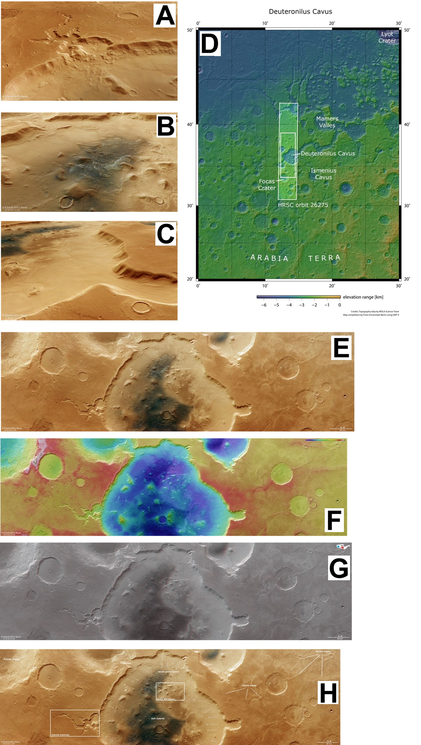 火星南部高地和火星北部低地之間的過渡區有許多不同的地質過程。在直徑120公里的德特羅尼盧斯高凹坑邊緣,一些深深的切谷格外引人注目,這些谷地是由隕石坑壁地下水滲漏造成的後退侵蝕形成的。窪地中的山丘和台地可能是高原平原的殘餘,也可能是一顆直徑約十公里的小行星撞擊火星後地殼的反彈,從而形成了隕石坑或窪地。圖中箭頭表示因山崩而造成的物質運輸的移動方向。 「皺脊」是薄熔岩流凝固的流動前緣。