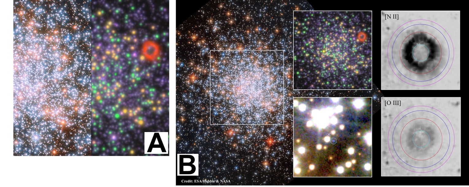 (B) The figure shows an image of the globular cluster NGC 1866, superimposed with a false color image from the MUSE data cube, where the ionized shell of the Planetary Nebula Ka LMC 1 is seen as a red ring, The greyscale images to the right illustrate the different size of the ionized shells of singly ionized nitrogen [N II] and doubly ionized oxygen [O III]. The magnified HST image near the center of the ring (cross) reveals the presence of a pale blue star – most probably the hot central star of the Planetary Nebula.